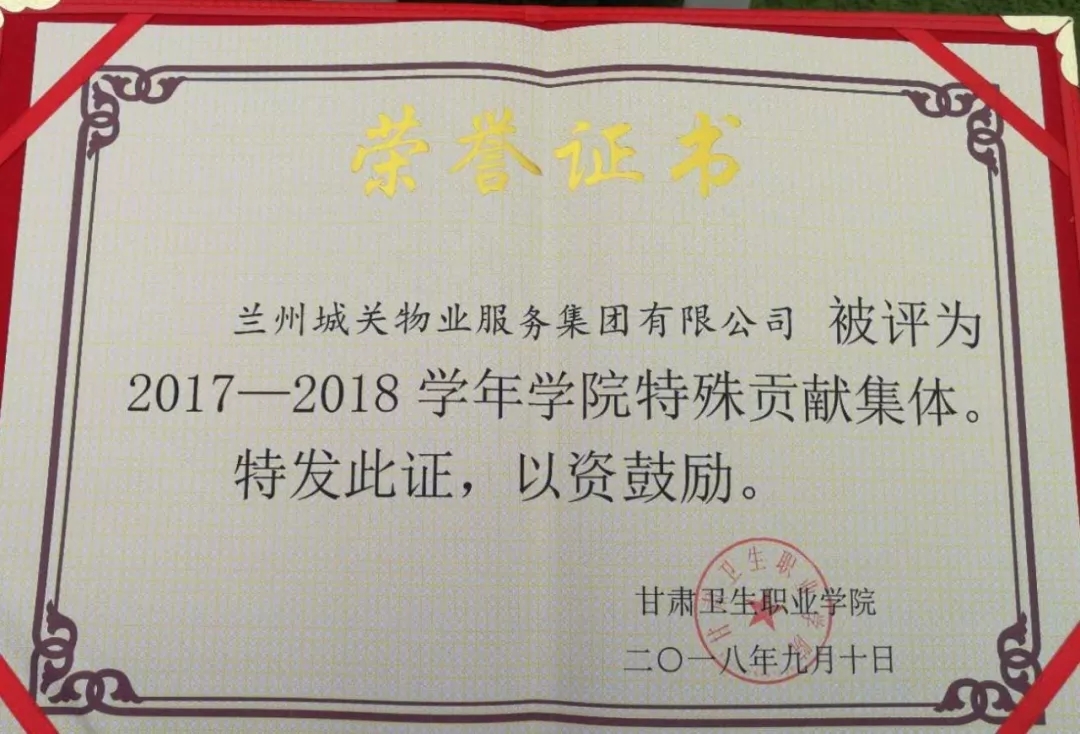 甘肅衛(wèi)生職業(yè)學(xué)院召開2018-2019學(xué)年開學(xué)典禮暨教師節(jié)表彰大會(huì)。城關(guān)物業(yè)服務(wù)集團(tuán)被評為2017-2018年學(xué)院特殊貢獻(xiàn)集體獎(jiǎng)。