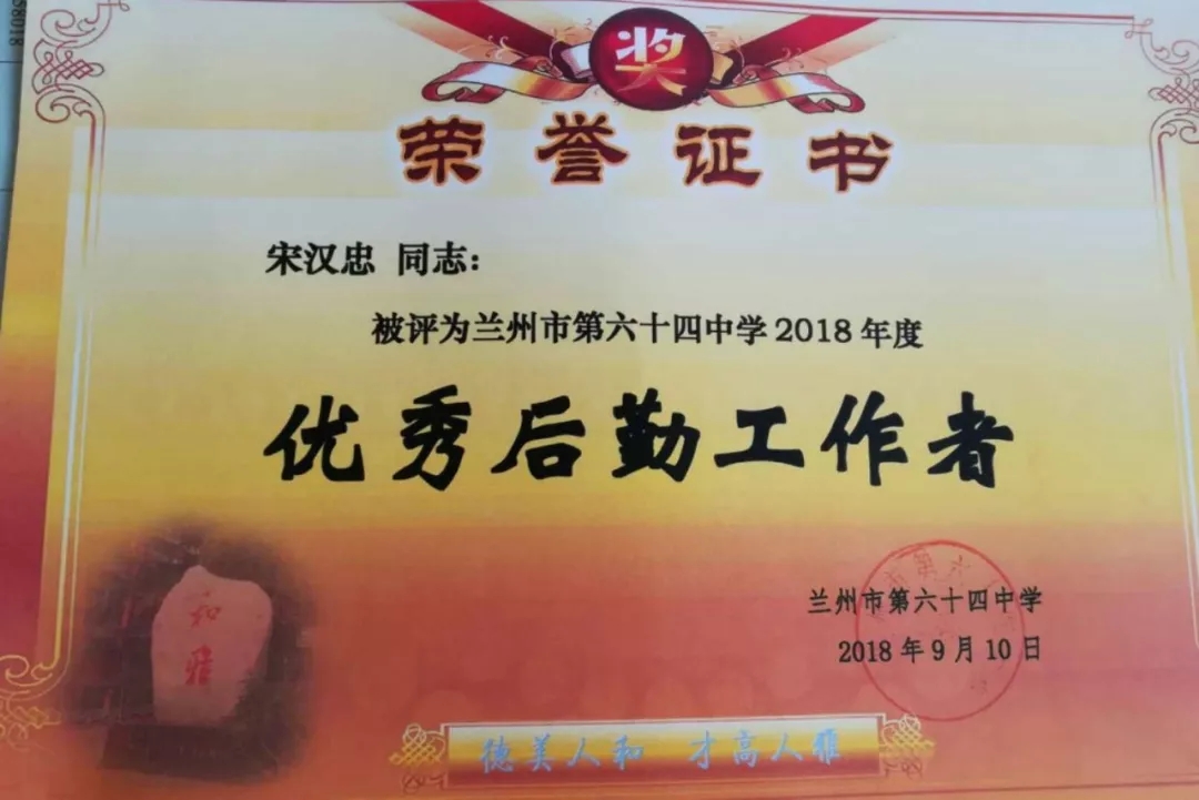 蘭州市第六十四中學(xué)召開教師節(jié)表彰大會(huì),城關(guān)物業(yè)員工宋漢忠等被評為“優(yōu)秀后勤工作者”。