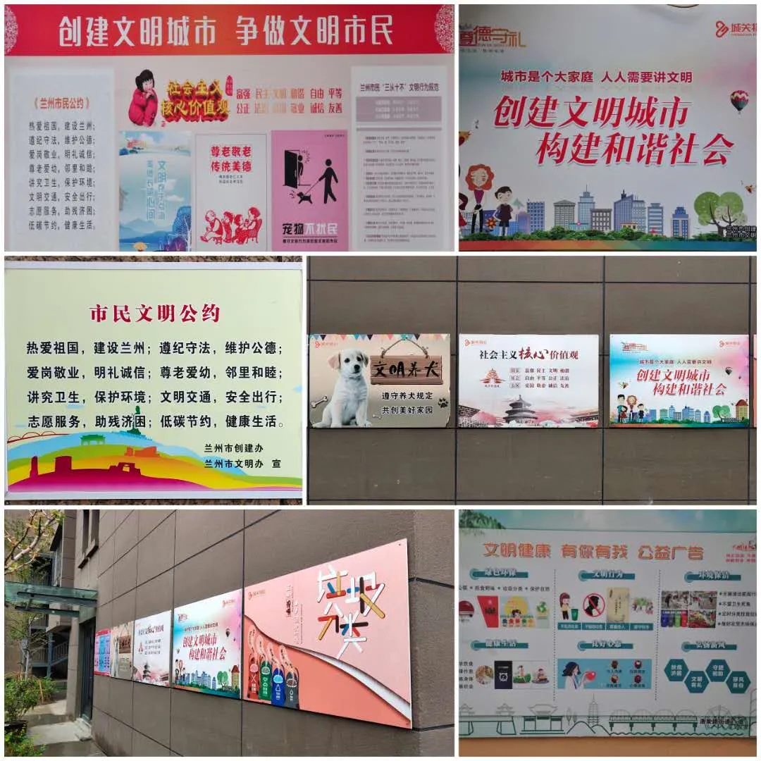 城關物業(yè)在創(chuàng)文期間加大工作力度,保證環(huán)境整潔,同時積極開展“精神文明”建設工作,在小區(qū)內各顯著位置張貼創(chuàng)文宣傳海報、宣傳展板,專門設立“蘭州市文明志愿者”崗,為業(yè)主宣傳創(chuàng)文工作。