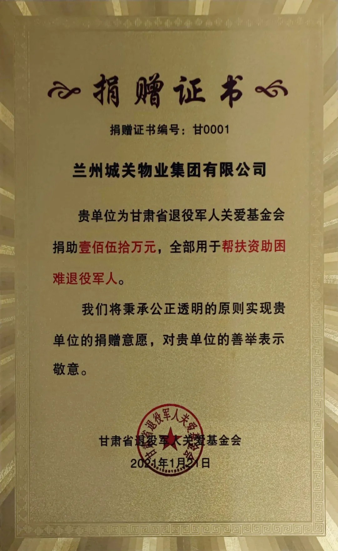 蘭州城關物業(yè)服務集團有限公司積極支持國防和軍隊建設,襄助退役軍人扶危濟困事業(yè),向甘肅省退役軍人關愛基金捐助150萬元善款,以實際行動為幫助退役軍人就業(yè)、解決退役軍人生產(chǎn)生活困難、加強軍政軍民團結工作貢獻力量、“錦上添花”。