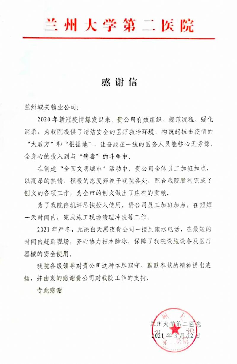 蘭州大學(xué)第二醫(yī)院后勤保障處劉處長(zhǎng)一行人專程來(lái)到蘭州城關(guān)物業(yè)服務(wù)集團(tuán)有限公司,將一面寫有“物業(yè)好管家 業(yè)主貼心人”的錦旗贈(zèng)予蘭州城關(guān)物業(yè)服務(wù)集團(tuán)有限公司總裁楊佳林手中,以此表達(dá)對(duì)于城關(guān)物業(yè)的感謝和認(rèn)可。劉處長(zhǎng)表示,2020年新冠疫情爆發(fā)以來(lái),城關(guān)物業(yè)有效組織,規(guī)范流程,為醫(yī)院提供了清潔、安全的醫(yī)療救治環(huán)境,與醫(yī)院一起構(gòu)筑起抗擊疫情的“根據(jù)地”。城關(guān)物業(yè)加班加點(diǎn)保障醫(yī)院后勤的同時(shí),積極配合醫(yī)院順利完成各項(xiàng)創(chuàng)文工作,為蘭州市創(chuàng)建全國(guó)文明城市做出了應(yīng)有的貢獻(xiàn)。